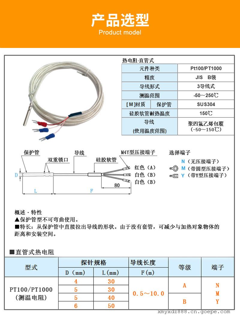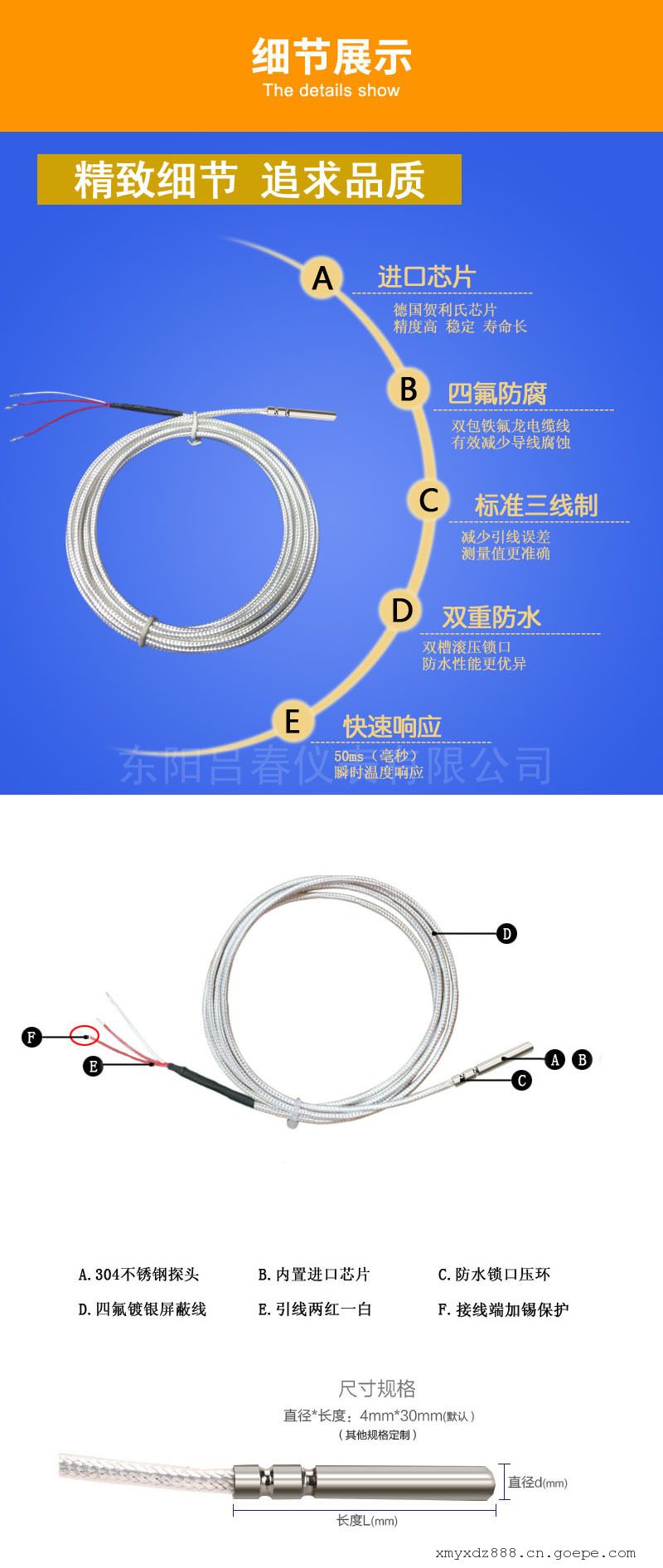 热电阻外壳为不锈钢304和316L,默认尺寸是直径4mm*长度30mm(如要其他尺寸可咨询客服),测温范围-50-200℃(另有特殊温度范围可选-200-200℃,或者是-50-500℃)引线是三线制双包铁氟龙镀银屏蔽线(防腐蚀耐油)。