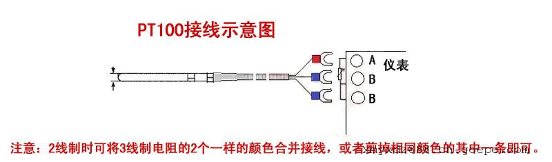 3线制pt100一般是一根红线二根白线,红线为A,二根白线都是B,二根B线(白线)都是一样的,可以按标识的A.B.B接口接上线即可。PT100是一个可变电阻,阻值随温度的变化而变化,当温度在0度的时候,量测AB(红白)两根线的阻值是100欧,100度是138.5欧,有两根白线是因为其中一根白线为补偿线,也可以两条白线装在一个接口当两线用,接三线是为了抗干扰,这样可以减少反馈到控制器的误差。如果是一白二红,则反着装,白线为A,红线为B。